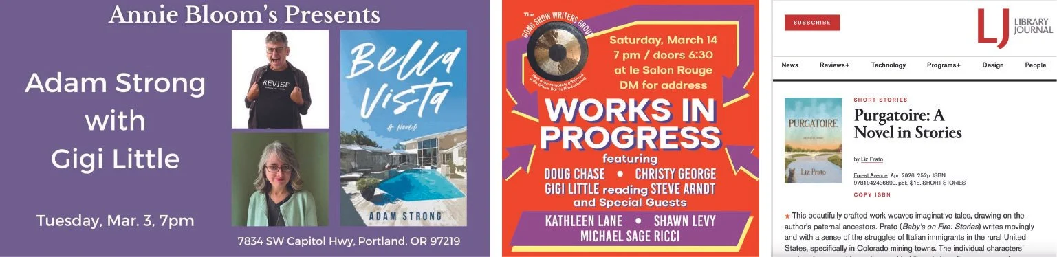 And Liz Prato has an official book launch on the books, at Powell’s City of Books, Tuesday, April 7, for her novel in stories Purgatoire. She’ll be in conversation with the lovely Rene Denfeld. The graphic below was made by Powell’s designer Baylie Barton.